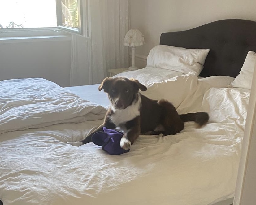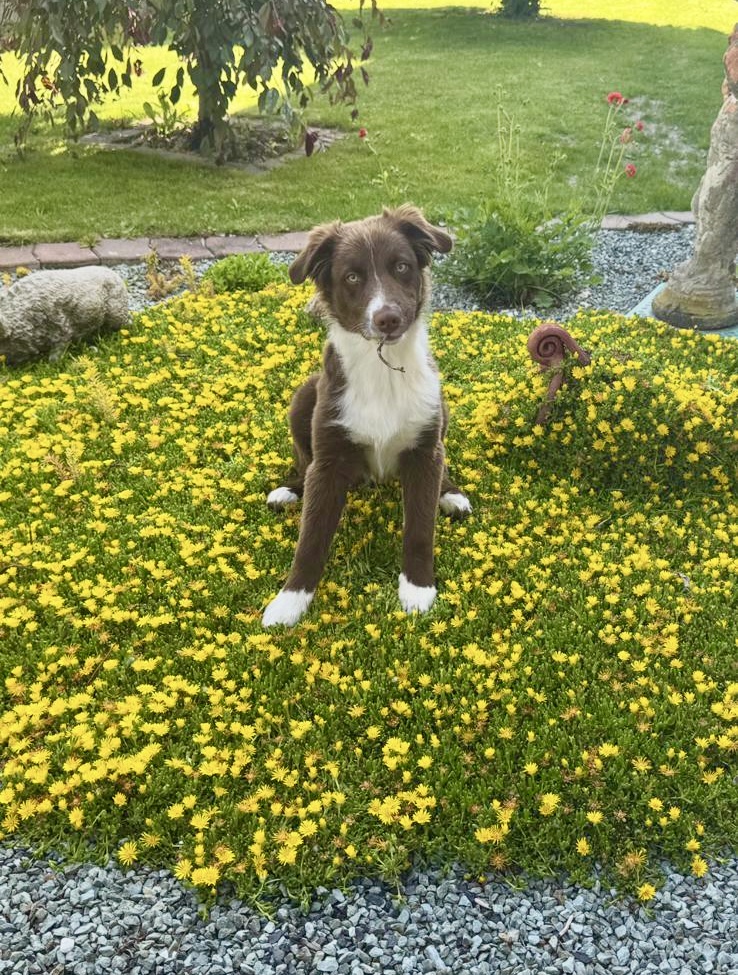 Farblich ist Grizzly ein schön gezeichneter red mit feiner weißer Blesse im Gesichtchen und einem durchgehenden recht symmetrischen weißen Kragen. Am Po sieht man etwas hellere braune Härchen, weshalb wir annehmen, dass aus dem red bi durchaus ein red tri werden könnte. Er ist der einzige aus dem Wurf mit einer 3/4 langen Rute.
